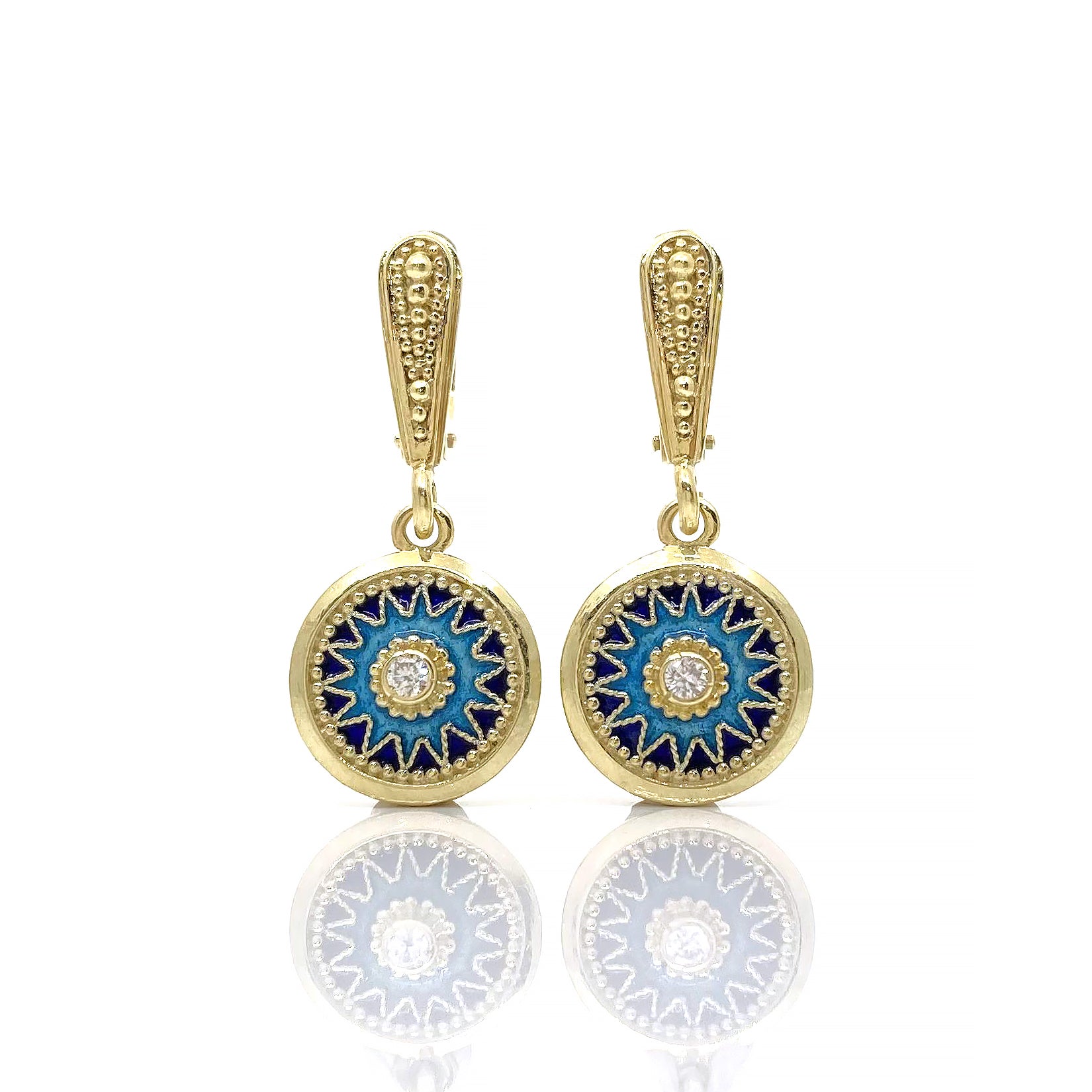 ოქროს საყურე გამშვენებული მინანქრით, ბრილიანტით და ცვარნამის ტექნოლოგიით