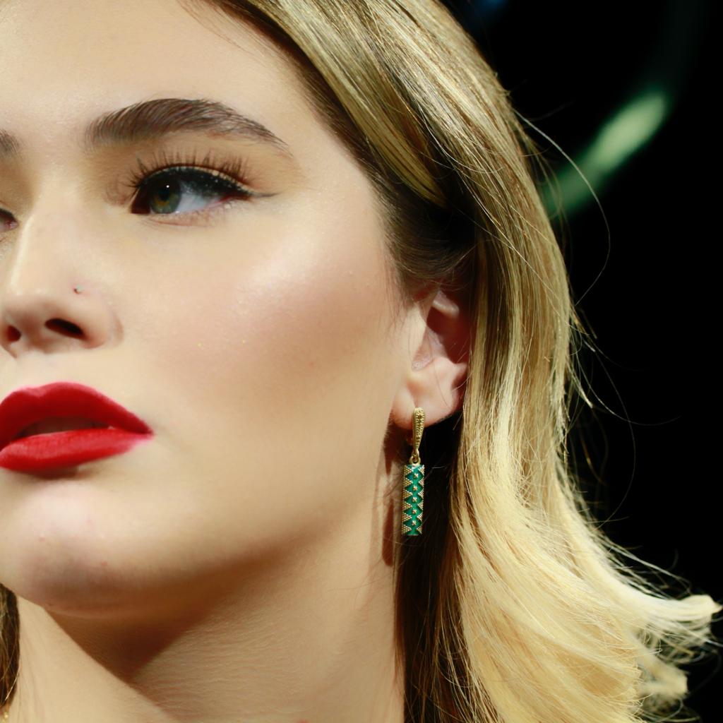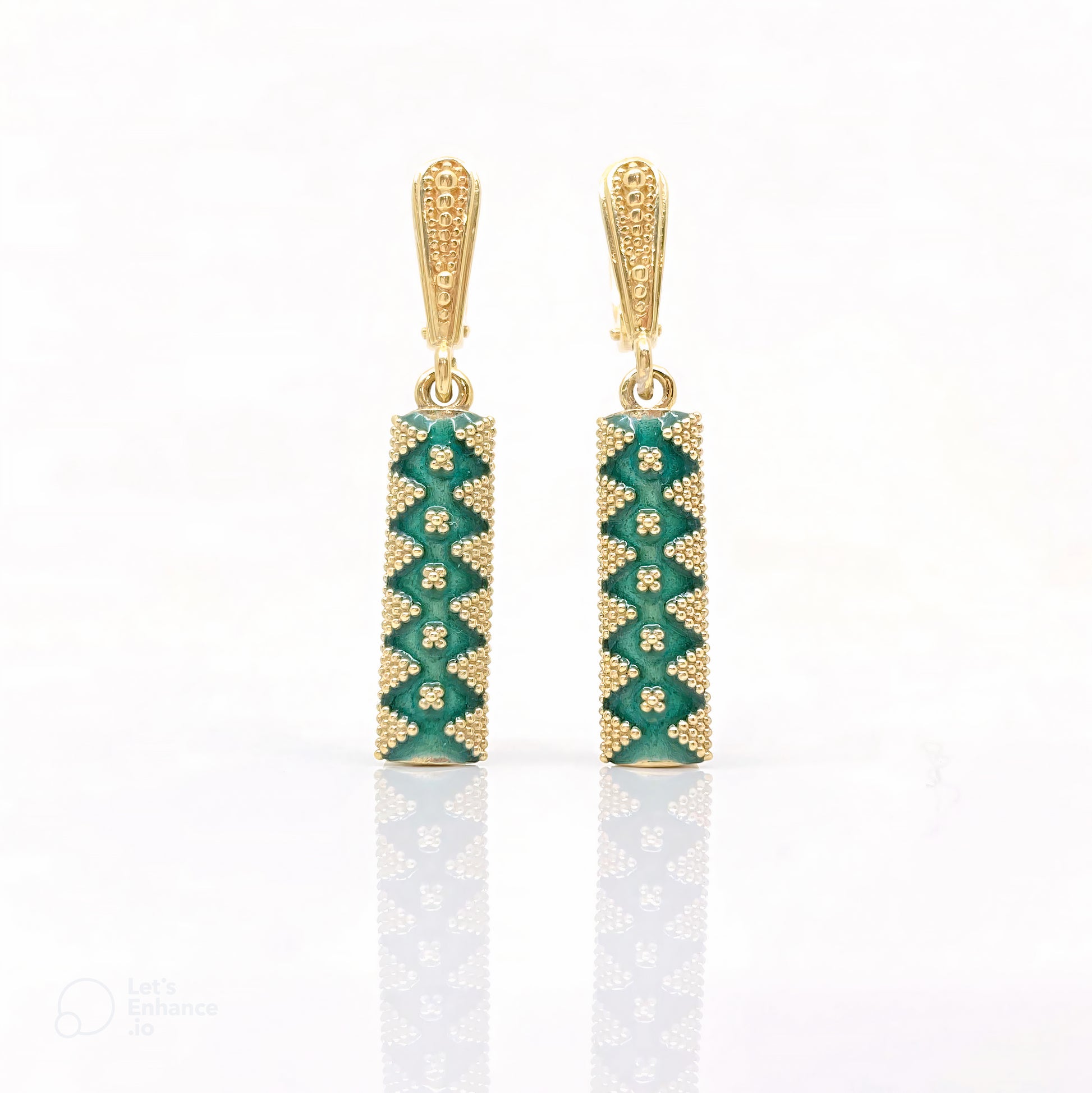 ოქროს საყურე გამშვენებული მწვანე მინანქრით და ცვარნამის ტექნოლოგიით