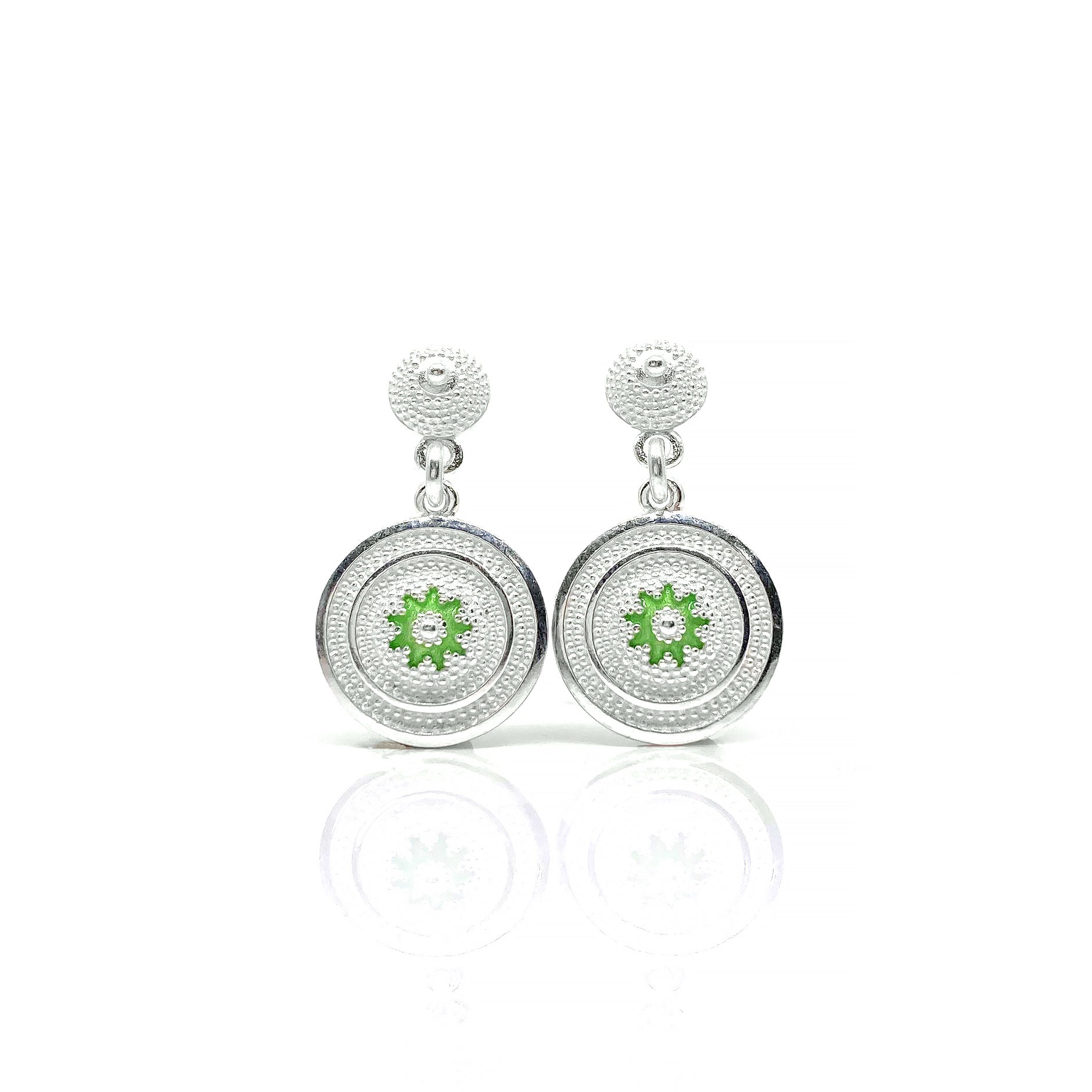 კლასიკური წრე, უზუსტესი სიმეტრიები და მწვანე მინანქარში გაფანტული ვერცხლის გრანულები — ეს საყურე თანამედროვეობისა და ანტიკური საიუველირო ტრადიციის სრულყოფილი შეხამებაა.